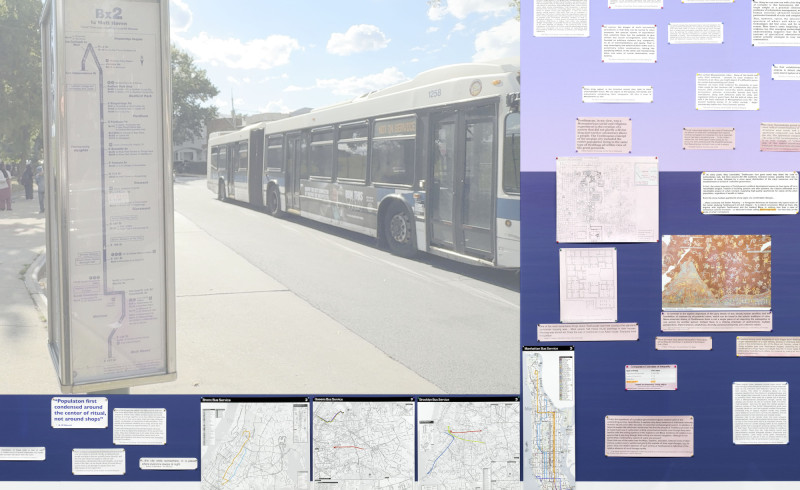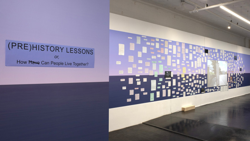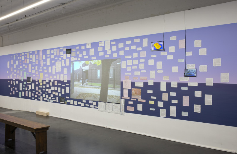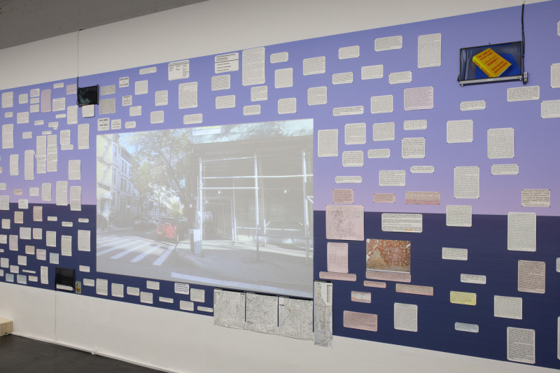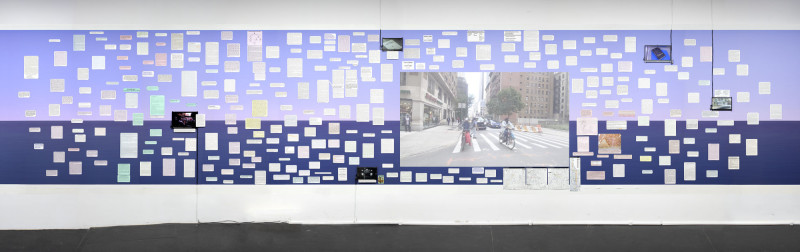 The installation’s film component anchors these reflections in the present, as the artist documents New York City’s streets from the passenger’s view on various bus routes. Inspired by History Lessons by Jean-Marie Straub and Danièle Huillet, the film, over 20 hours long, lends an anthropological lens, weaving time and motion through the fixed texts to bring historical and philosophical discourse into urban life.