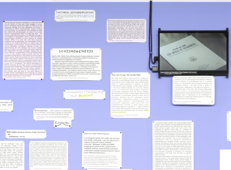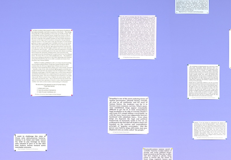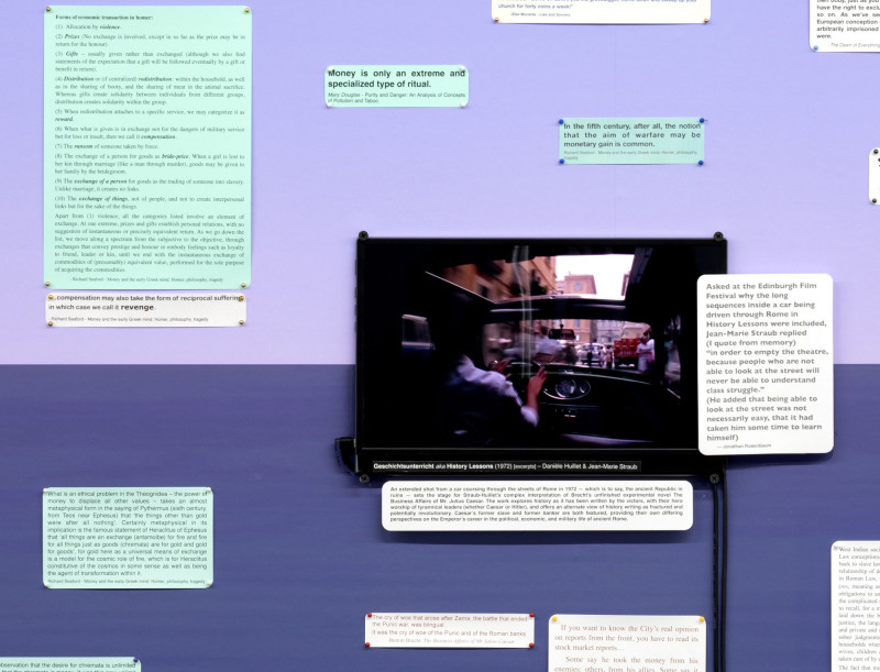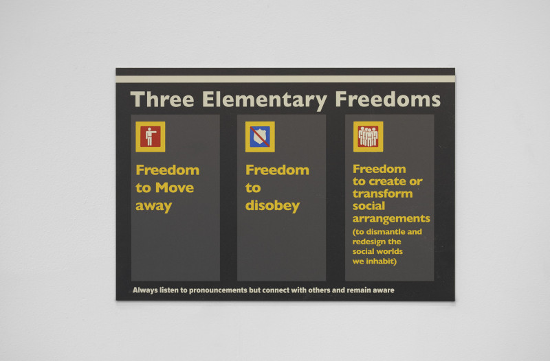The exhibition combines the concept of a “commonplace book” with the cinematic ability to explore history and complex narratives. Traditionally, commonplace books are personal collections of significant quotes, notes, and ideas meant for reflection. Here, this concept expands into a large-scale wall installation of citations, film excerpts, and images. These references—drawing from The Dawn of Everything by David Graeber and David Wengrow, as well as works by thinkers like Marshal Sahlins, Pierre Clastres, James C. Scott, Carolyn Merchant, Benedict Anderson, Bertolt Brecht, and Raul Vaneigem (among others),—form a web of interconnected ideas on human societies, social organization, and history.