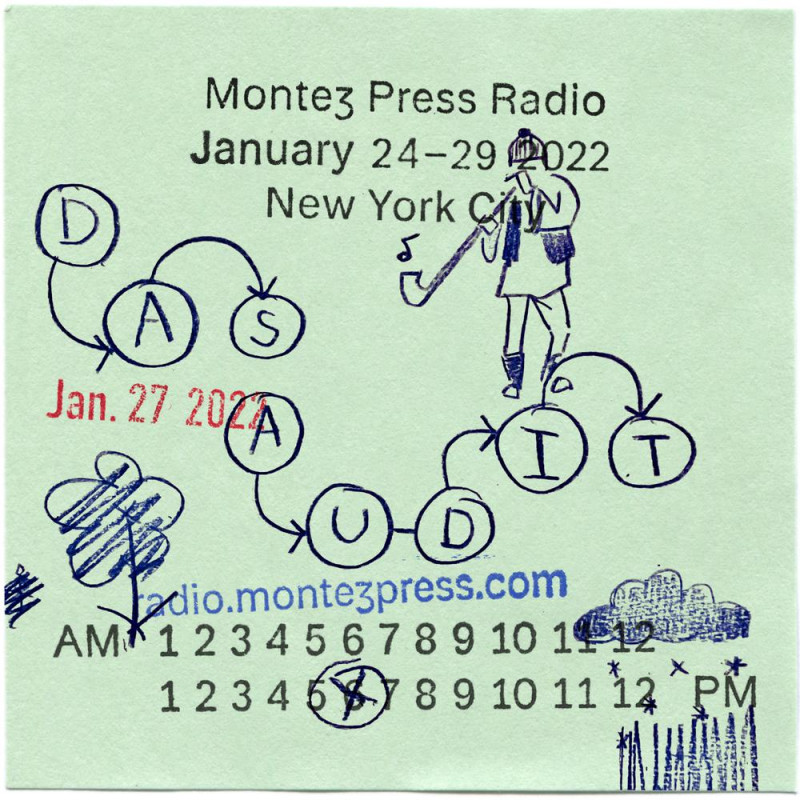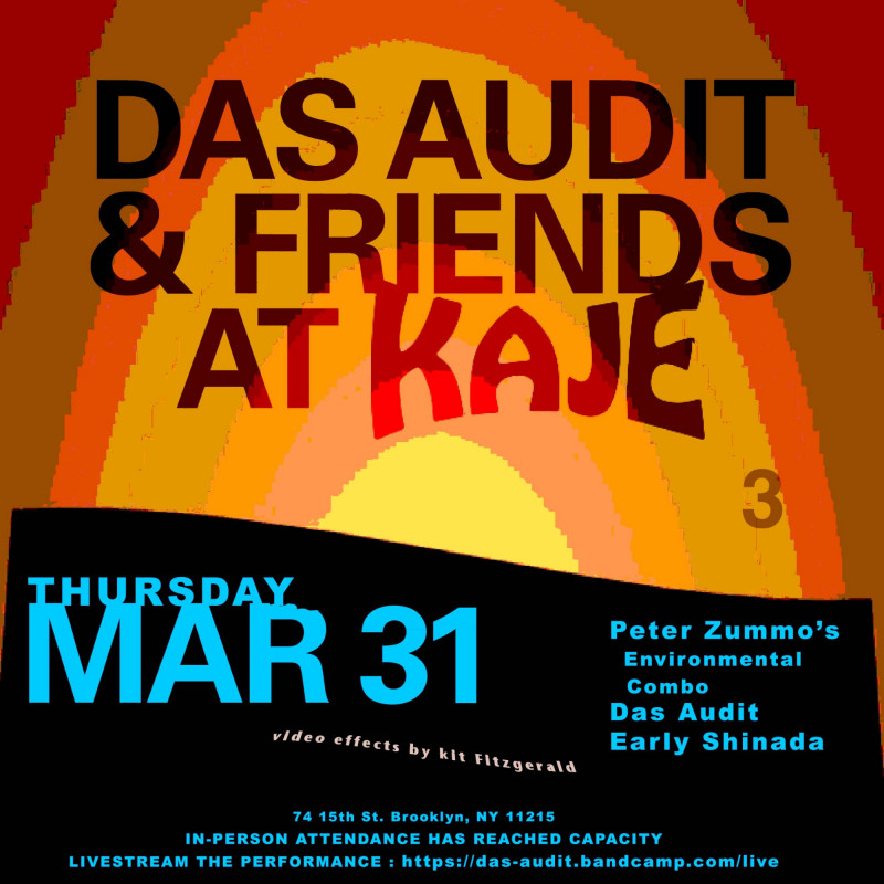 Das Audit (Eve Essex, Dan Fox, Craig Kalpakjian) took over KAJE’s Gowanus gallery space for six weeks February and March 2022 to mount a series of performances. Das Audit’s lineup expanded with each event, performing as a trio on February 27th; as a quartet with Kevin Kenkel on drums, March 13th; and Thursday, March 31st, as a quintet with Max Gordon on keyboards.